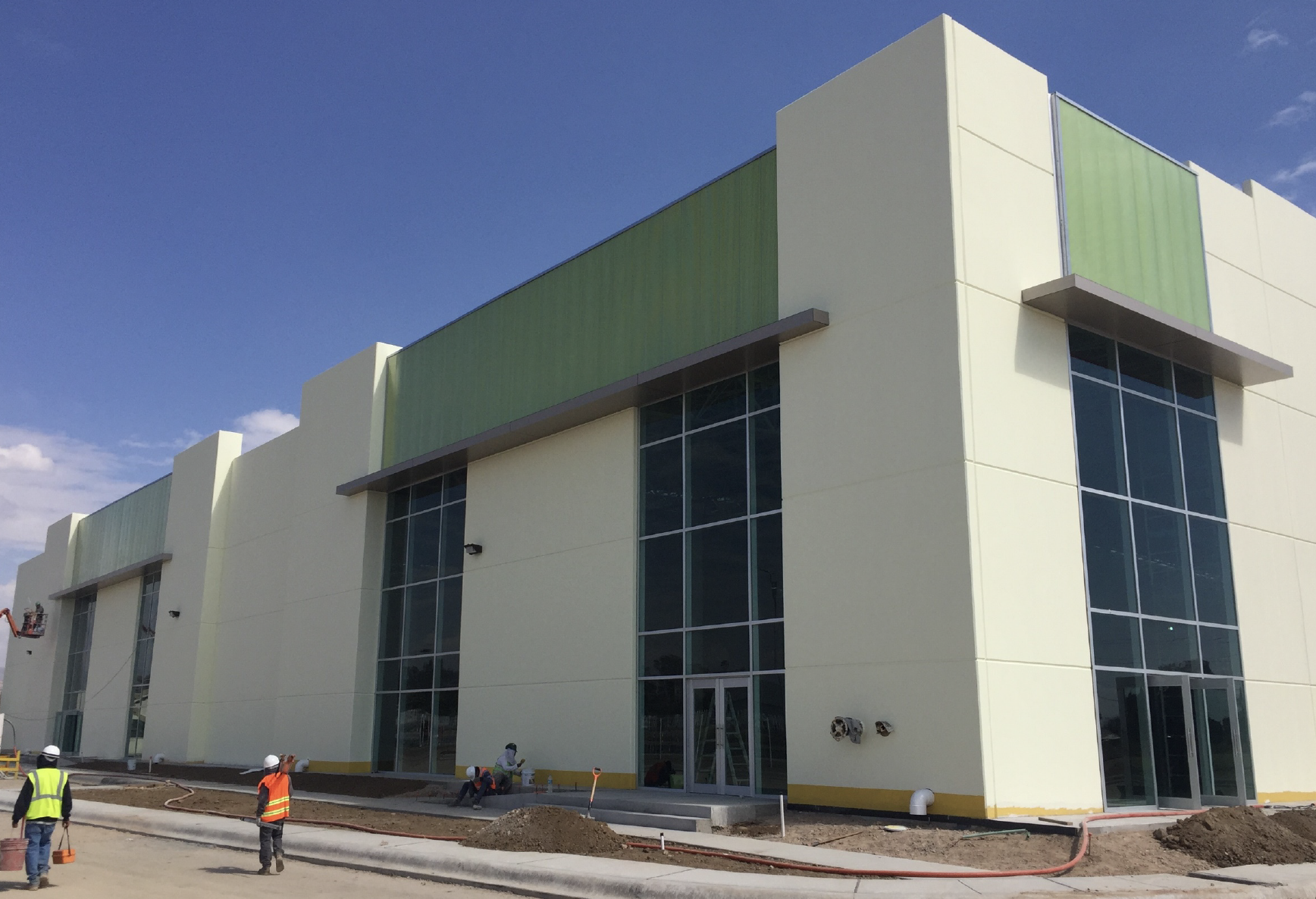 Como elemento protagónico, se desarrolló un canopy de panel de aluminio Alucomex en color Champagne, aportando protección y una presencia elegante en el acceso principal. La envolvente se complementa con vidrio Saint-Gobain Tintex Verde, seleccionado por su desempeño en control solar, y policarbonato 3D Lite Verde Danpalon, que introduce textura, iluminación difusa y carácter contemporáneo.