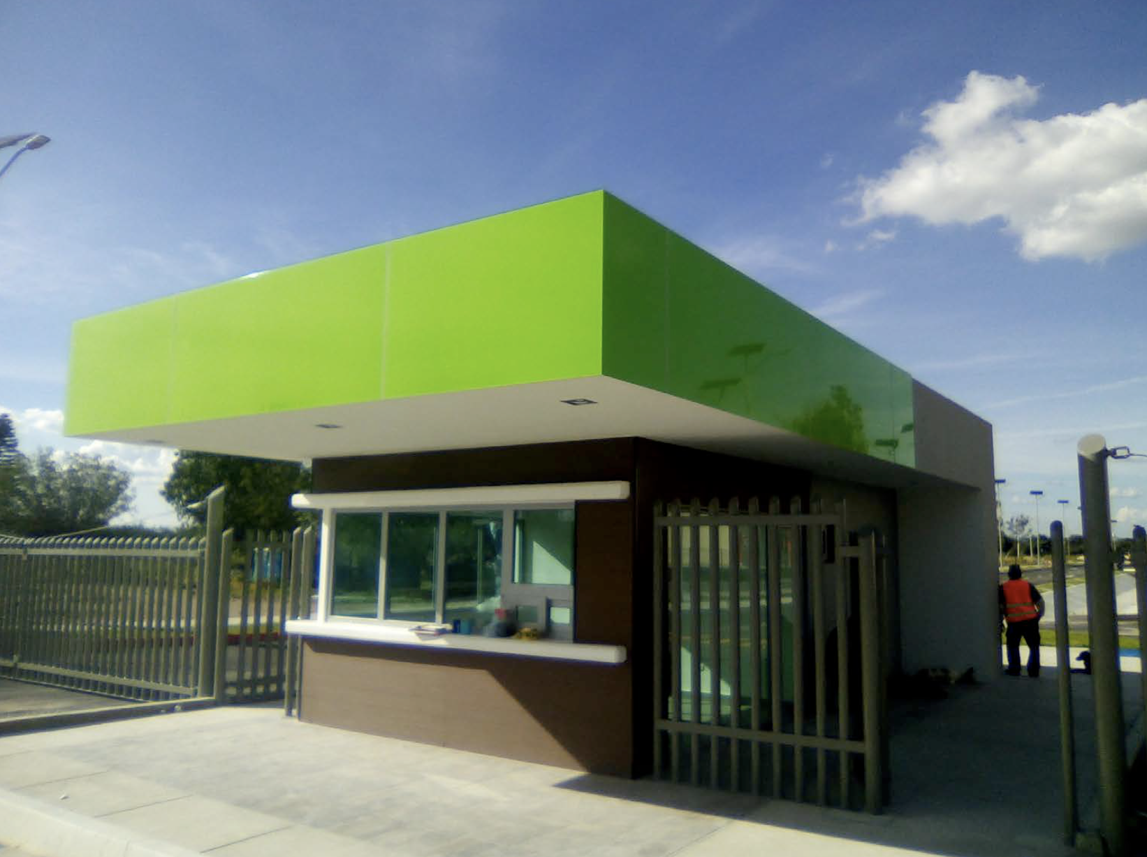 El proyecto integra un faldón de panel de aluminio Alcopalme en color Verde K, concebido como elemento de remate y transición volumétrica en fachada. Este sistema no solo aporta una presencia arquitectónica definida, sino que también garantiza alta resistencia a la intemperie, estabilidad de color y bajo mantenimiento, cualidades fundamentales en envolventes expuestas.